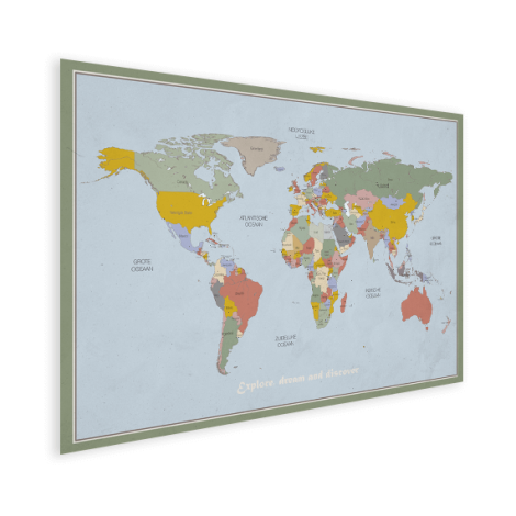 Ben je op zoek naar een speelse wereldkaart, die toch in ieder interieur past? Dan zit je met deze wereldkaart gebakken. Doordat de wereldkaart bestaat uit verschillende lichte kleurtjes, heeft de kaart een rustige, vintage uitstraling. De leuke quote aan de onderkant van de wereldkaart maakt het helemaal af. Wil jij vanaf de bank alvast beginnen met "Explore, dream and discover"? Aarzel dan niet langer en bestel snel!